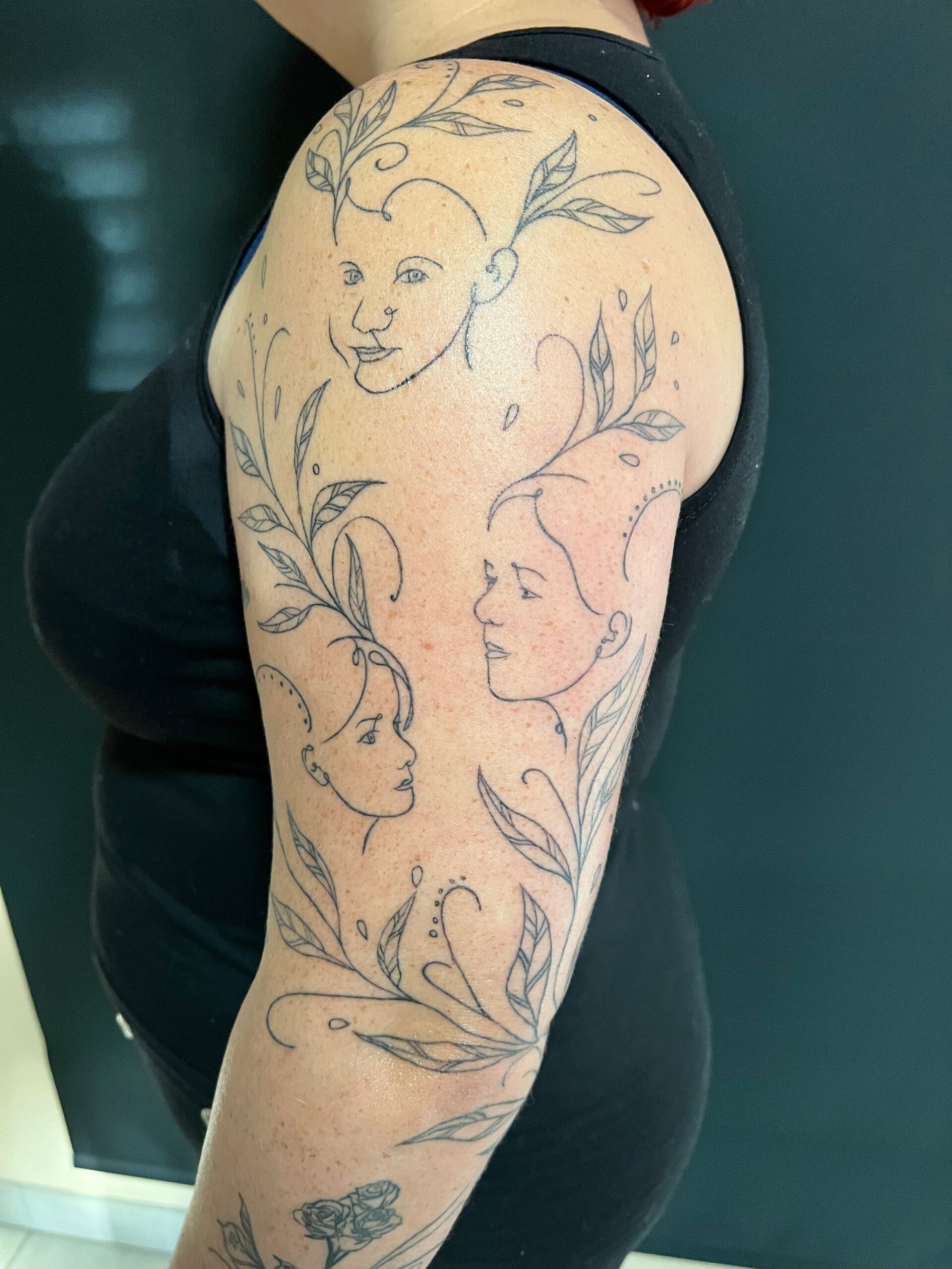 Admirez le tatouage floral qui monte sur toute la jambe, un projet réalisé en étroite collaboration avec notre cliente. Ce tatouage incarne notre style et notre capacité à créer des œuvres d'art personnalisées et évolutives. Contactez-nous pour discuter de votre projet unique !
